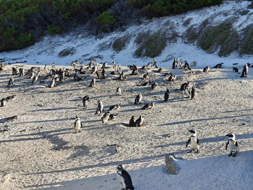 Kolejna niespodzianka przed nami już za chwilę, ale póki co nasz kierowca wytoczył wielki autokar znów na wąskie drogi wiodące przez malownicze miasteczka nad brzegiem oceanu. Holendersko i brytyjsko brzmiące nazwy ulic przypominają o czasach, kiedy to RPA była właśnie we władaniu europejskim a koloniści, starali się odtworzyć na dalekim południu choć trochę miejsca krajobrazy bliskie ich sercom. Udało im się to naprawdę bardzo dobrze. Wiele z tych miasteczek sprawia wrażenie, jakbyśmy cały czas byli na starym kontynencie a jeden z oficjalnych języków używanych w RPA – Afrikaans – do złudzenia przypomina język Holenderski. Było już dość dobrze po południu, kiedy autokar zatrzymał się na parkingu przy plaży. Nie była, jednakże to taka zwykła plaża. Boulders Beach, bo tak właśnie nazywa się to miejsce jest domem dla liczącej tysiące sztuk kolonii pingwinów afrykańskich. Małe czarno-białe ptaki przechadzają się po plaży nie robiąc sobie nic z obecności ludzi, którzy to z drewnianych kładek ustawionych nad piachem bez przerwy robią zdjęcia pokracznie tuptającym nielotom. To chyba pierwszy raz w moim życiu, kiedy na własne oczy widziałem pingwina na wolności. Nie w ZOO czy parku, ale w jego bądź co bądź, naturalnym środowisku!